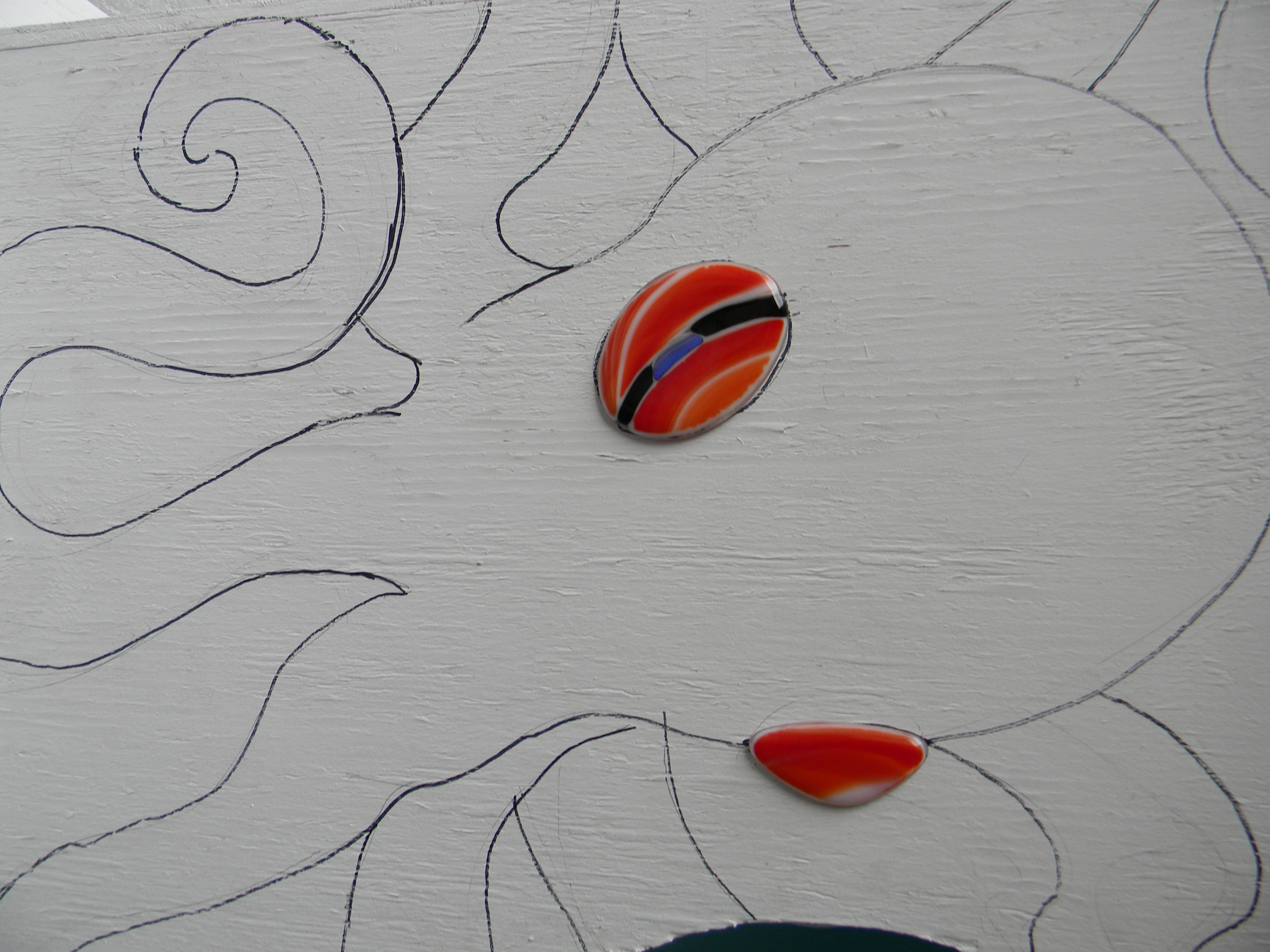 I signed the artwork on a piece of glass near the front door with a diamond bit and Dremel. I don’t have a favorite image in the design. I love everything! We spent many fun, family nights and weekends cutting and gluing glass.