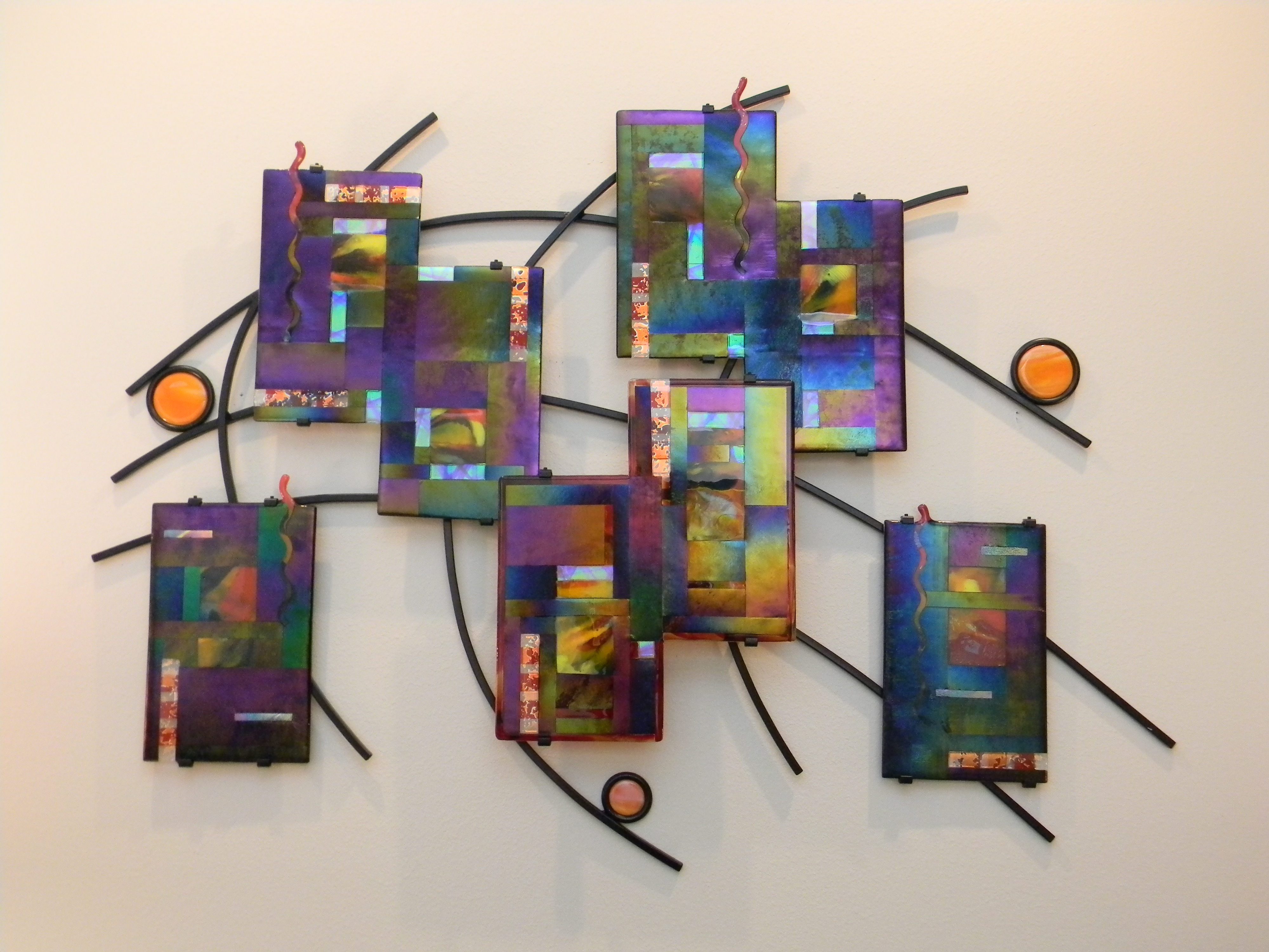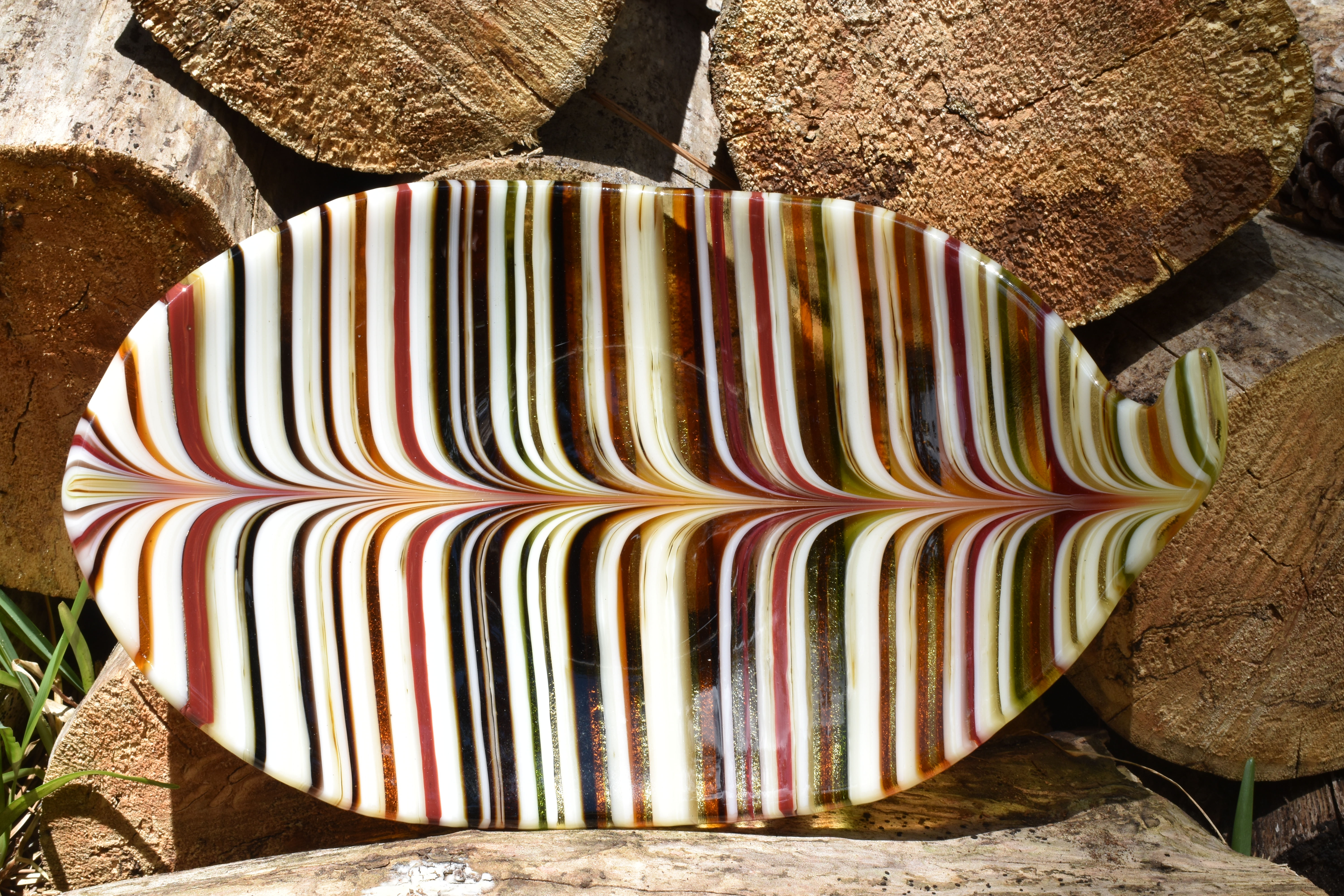 I gathered miscellaneous fusible materials that I knew would bring attention to my design. I used dichroic pinwheels for my anchor design details. The delicate circular patterns add visual interest and sparkle to the design. Dichroic Firestrips add flash and playful diagonal lines. The twisted cane adds striking color and a three-dimensional quality to the bouncy grouping. The characteristic round shape of the murrini adds structure and direction that encourages the viewer to interact with the assorted materials.